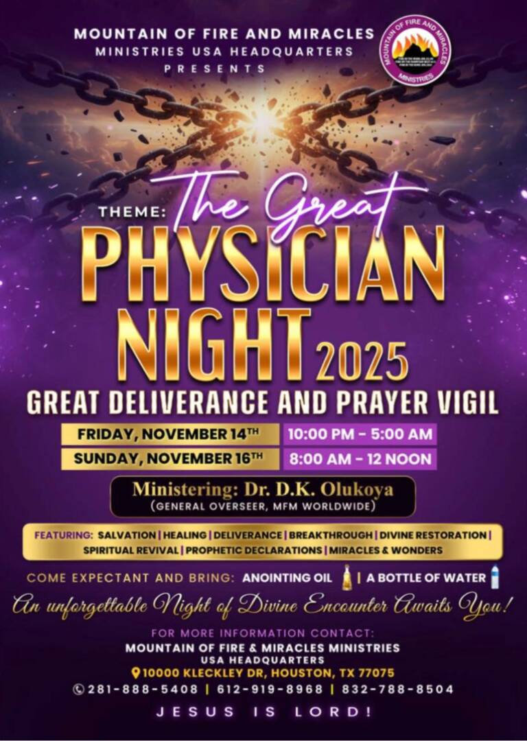 Mountain of Fire and Miracles Ministries, is a full gospel ministry devoted to the revival of apostolic signs, Holy Ghost fireworks and the unlimited power of God to deliver to the uttermost.